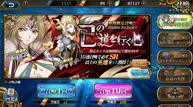 いつもより早く始まった大型アップデートのためのメンテが終了してログインできたので、さっそく気になるガチャ「己の道を行く心」へ!
