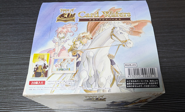 箱は自分が大好きなファンタジアのイラストで、とても嬉しいです! テイルズ オブ シリーズ 30th Anniversary カードウエハース パッケージ 斜め テイルズ オブ シリーズ 30th Anniversary カードウエハース 箱 開封 箱を開封すると合計20個のウエハースが!